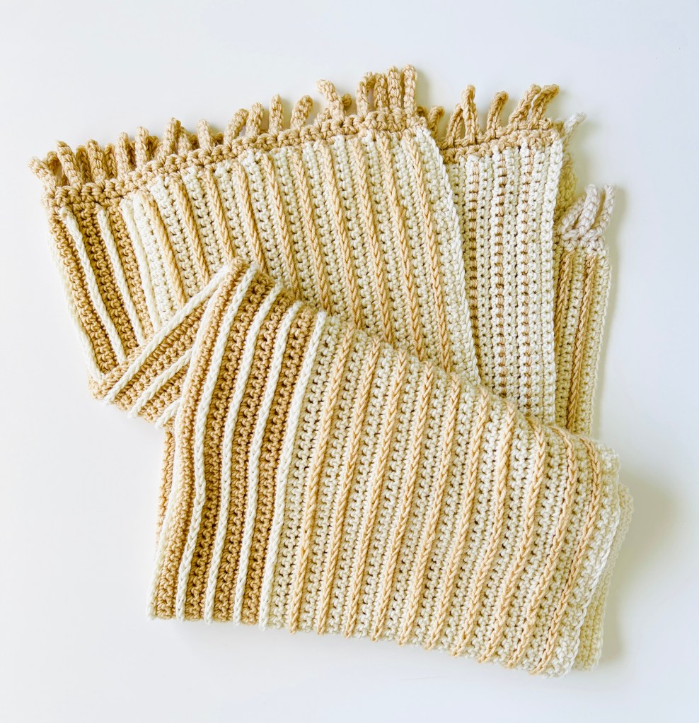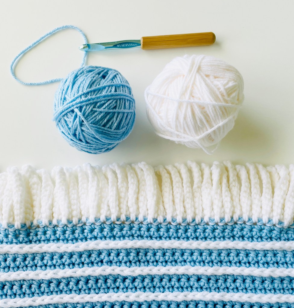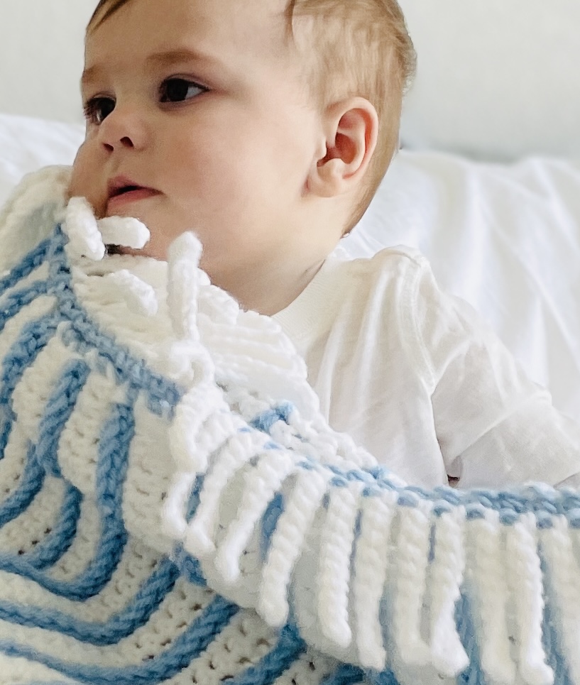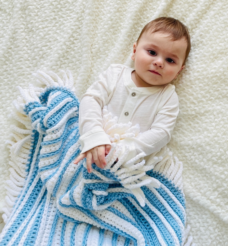 A 32”x 32” small blanket that makes a great playmat or stroller throw . Two stitches and two yarn colors finished with a slip stitch crochet fringe. This is a relaxing and easy project that works up quickly and makes a great gift!