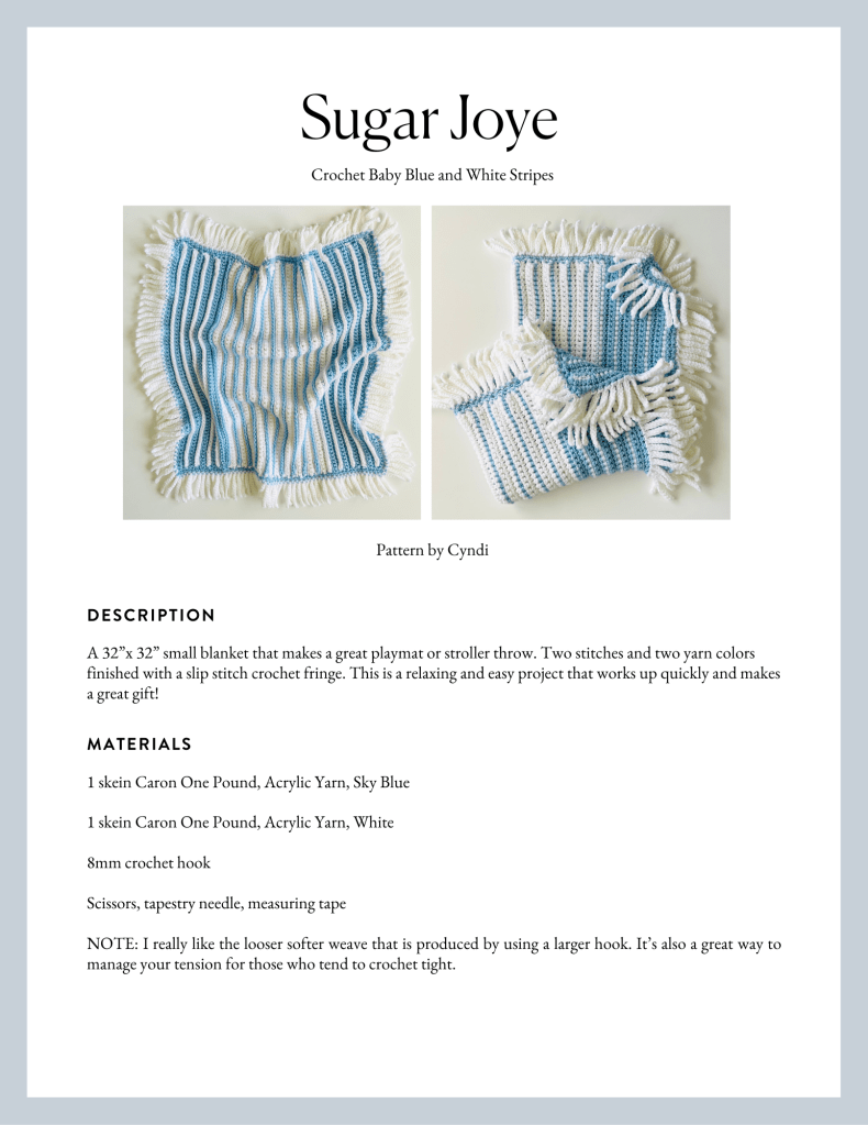 Thank you so much for stopping by! If you decide to make the Sky Blue and White Baby Stripes Blanket you can tag Tiff at #DaisyFarmCrafts on Instagram or send me an email sugarjoye@gmail.com I would love to see it!